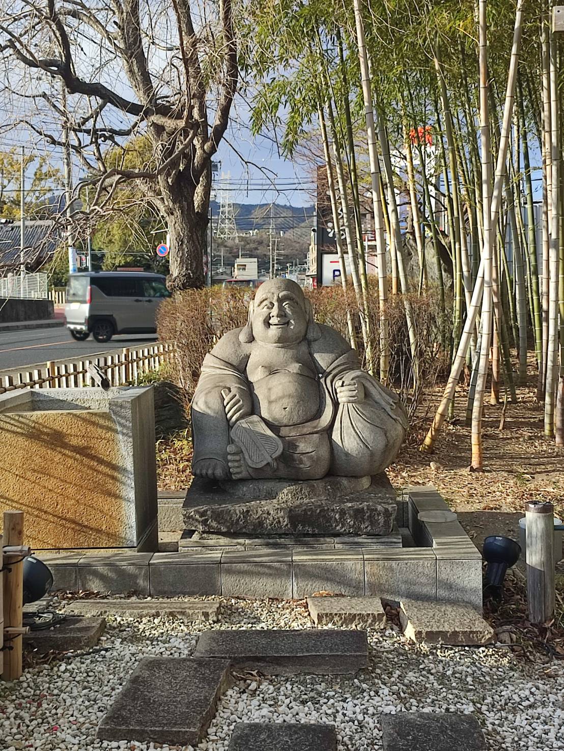 (お風呂上がりに施設敷地内を歩いていると、なんとも福々しい笑顔の布袋様に出会いました。布袋様は七福神の一柱で、「笑門来福」の象徴とも言われています。この満面の笑みを見ているだけで、こちらまで幸せな気分をお裾分けしてもらったような気がします。皆様にも何か良いことがありますように!)