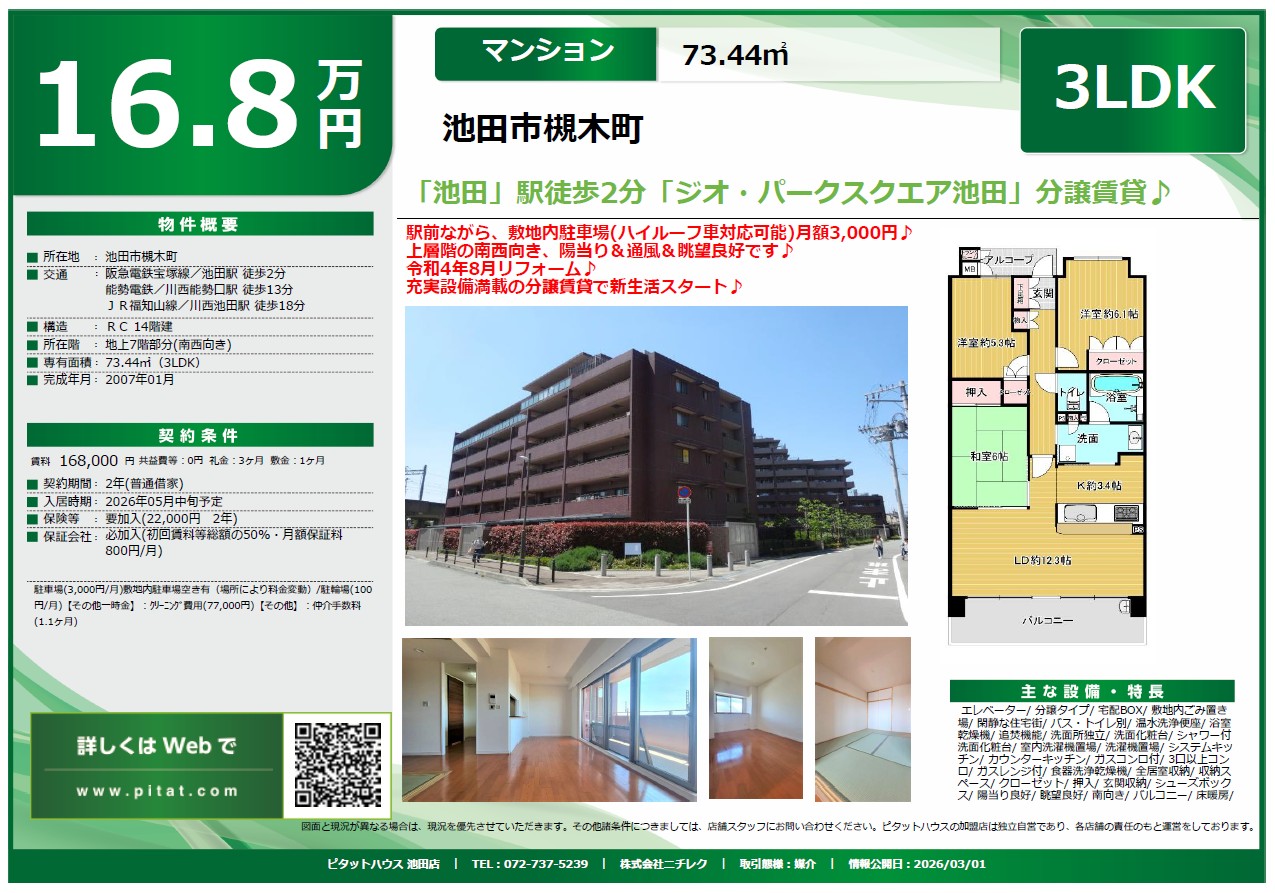 2026.3.11 分譲賃貸マンション 池田駅徒歩2分 3LDK(73.44㎡) 令和4年リフォーム【2026-03-11更新】物件紹介 |ピタットハウス池田店 株式会社ニチレク