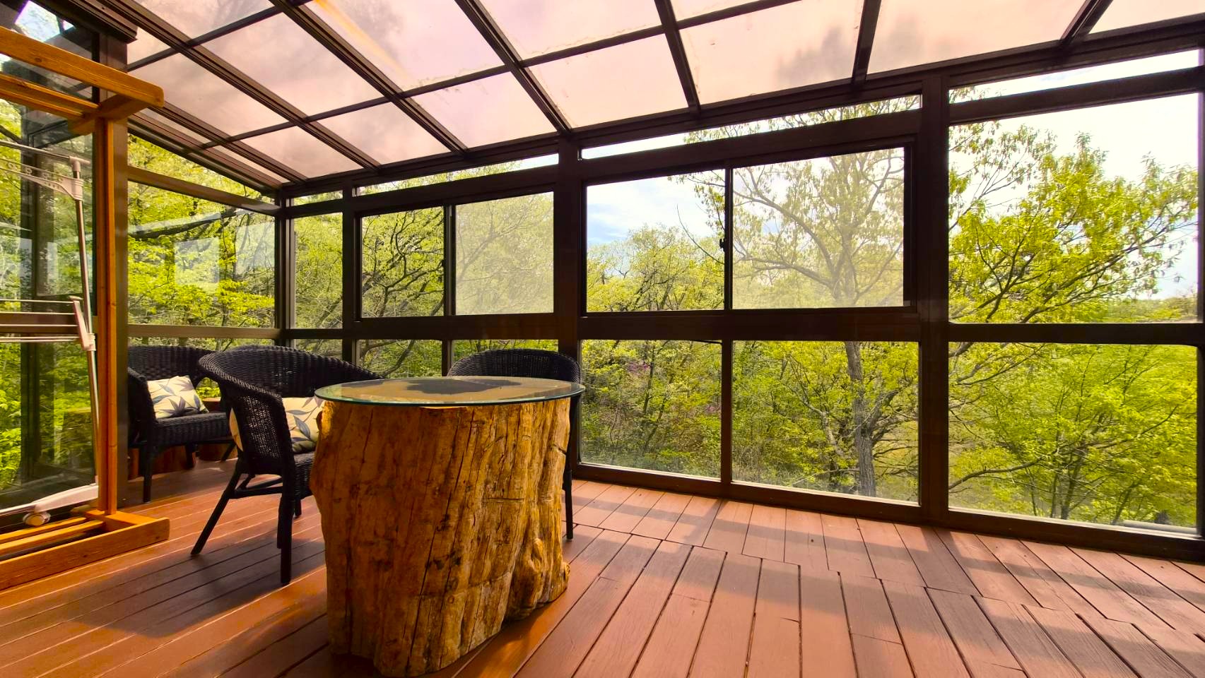 この物件の自慢はやはり深い緑が視界いっぱいに広がるサンルーム!