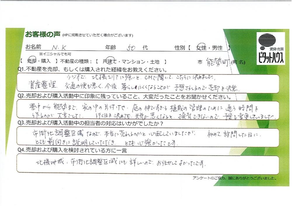 市街化調整区域なので、本当に売れるのかと心配していましたが、初めて訪問した日にとても前向きに説明していただき